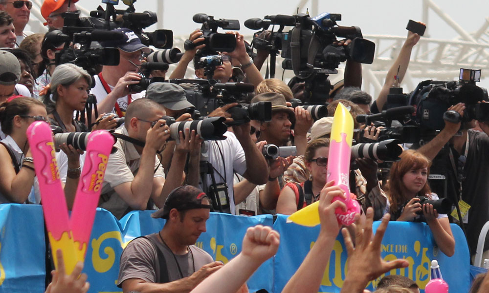The Nathan's Hot Dog Eating Contest is an annual American competitive-eating competition, which is run as a publicity gathering event by Shea Communications. It is held each July 4 at Nathan's Famous Corporation's original, and best-known restaurant at the corner of Surf and Stillwell Avenues in Coney Island, a neighborhood of Brooklyn, New York. In 2011 over 40,000 spectators attended the event, and an additional 1.949 million viewers watched it live on ESPN television when Joey Chestnut ate 62 hot dogs and buns. (Wiki)