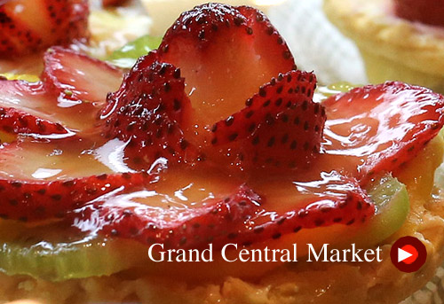 Let's see, there's wine and cheese, fresh fruits and veggies, an unbelievable variety of breads, desserts to die for, there's samon and clams and shrimp and crab cakes, and soups and sauces as well, there's antipasta and a myriad of deli delights, and coffee beans freshly ground, and nuts and grains, and sausages, steaks, salami, there's oils and dressings, and pies of all flavors, there's cookies and muffins and mini pizzas, and fresh cut flowers from heaven. It's the Grand Central Market and it's a sight to behold.
